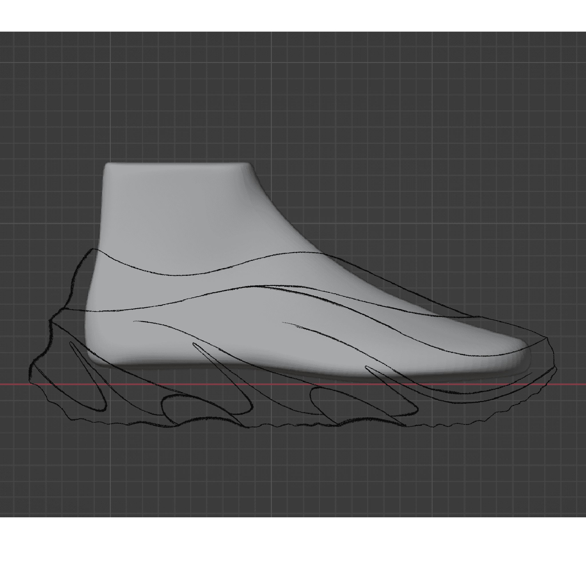 Using Gravity Sketch in VR, I translated my favorite design sketches into rough 3D forms. VR modeling allowed me to work intuitively with organic shapes and immediately understand how forms wrapped around the foot in three dimensions. By creating a base silhouette and iterating through duplication, I could add and remove design details easily.