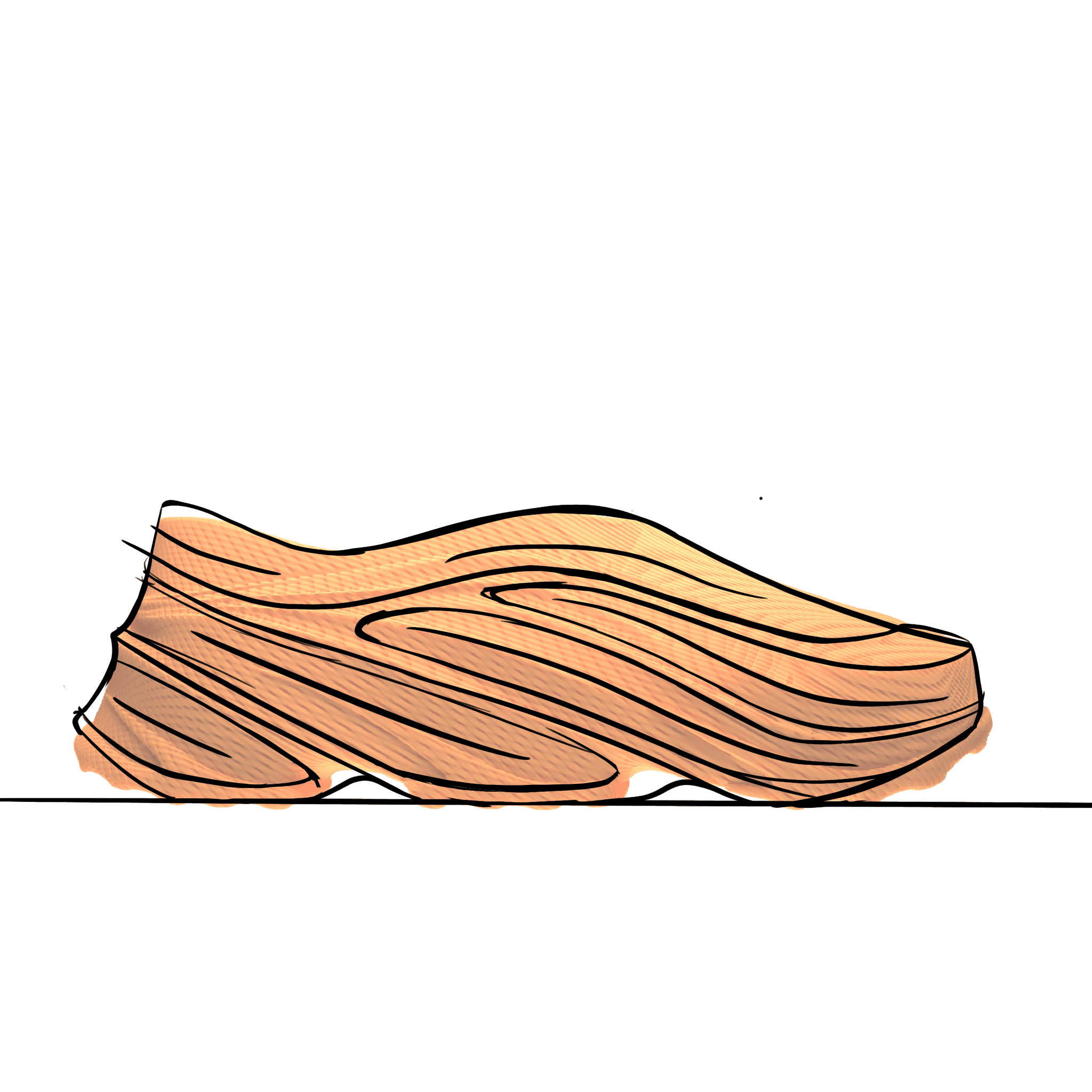 The desert became my visual and conceptual anchor. I was drawn to the duality of desert landscapes; beautiful yet daunting, inviting yet isolating. Sharp lines cutting through sand dunes, stark contrasts between light and shadow, the feeling of stepping into vast emptiness. This mirrored my own experience: Creating my first wearable shoe using untested technology, stepping into unknown territory. The design language translates this through flowing, organic forms interrupted by sharp lines mimicking how sunlight contrasts on the sand dunes.